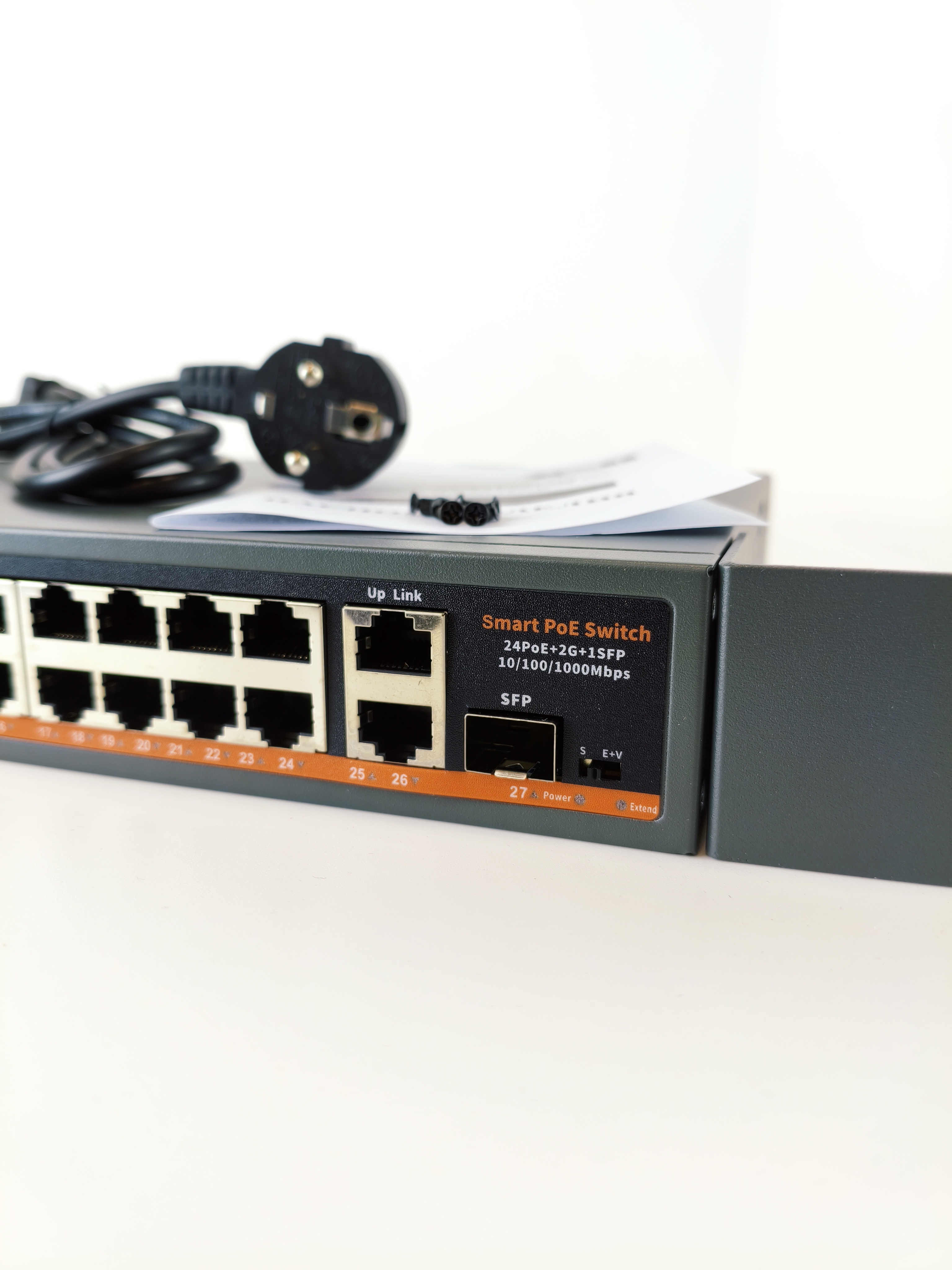 24 порта PoE 10/100, 2 UpLink 100/1000, 1 SFP UpLink 100/1000 |