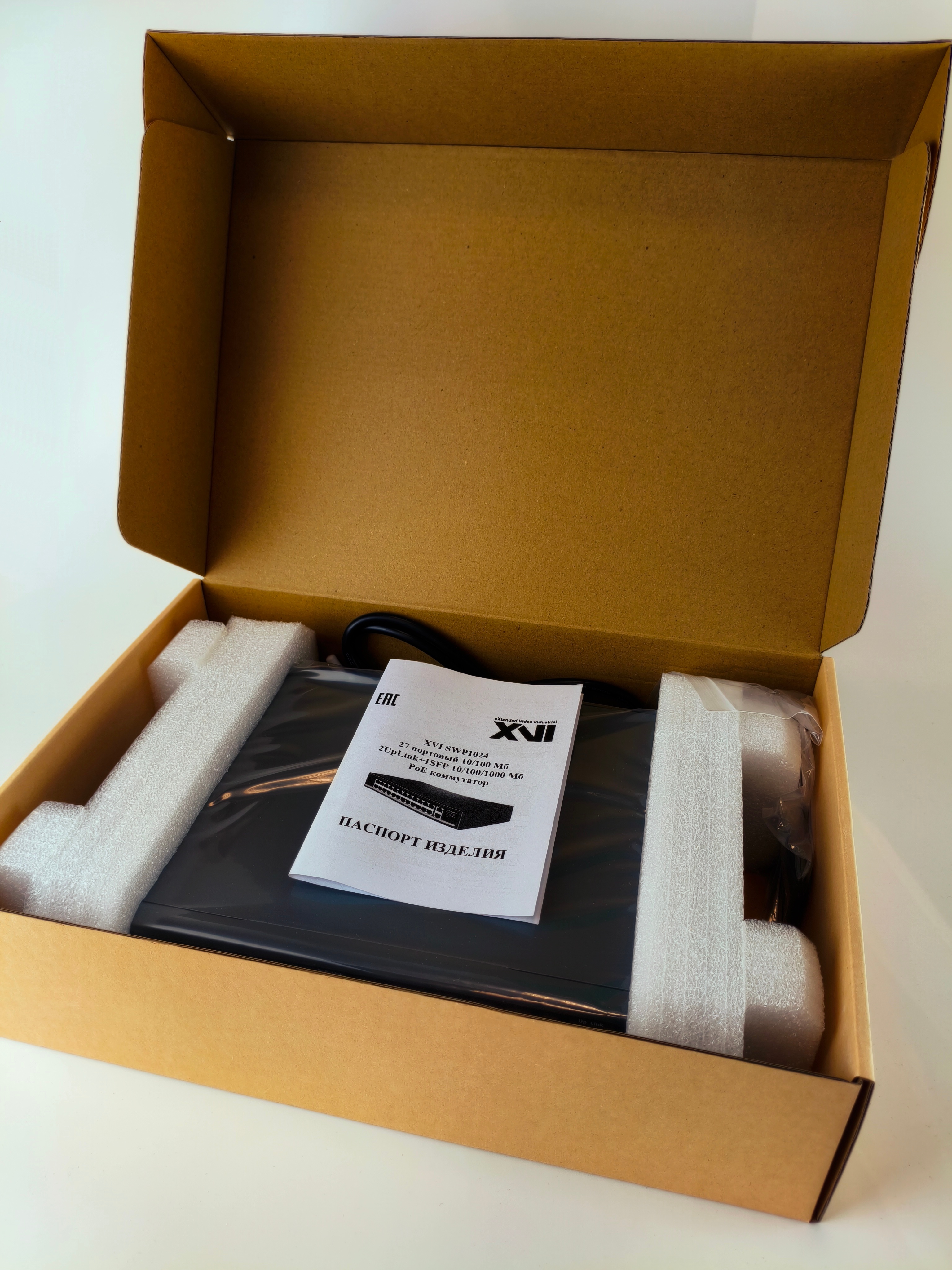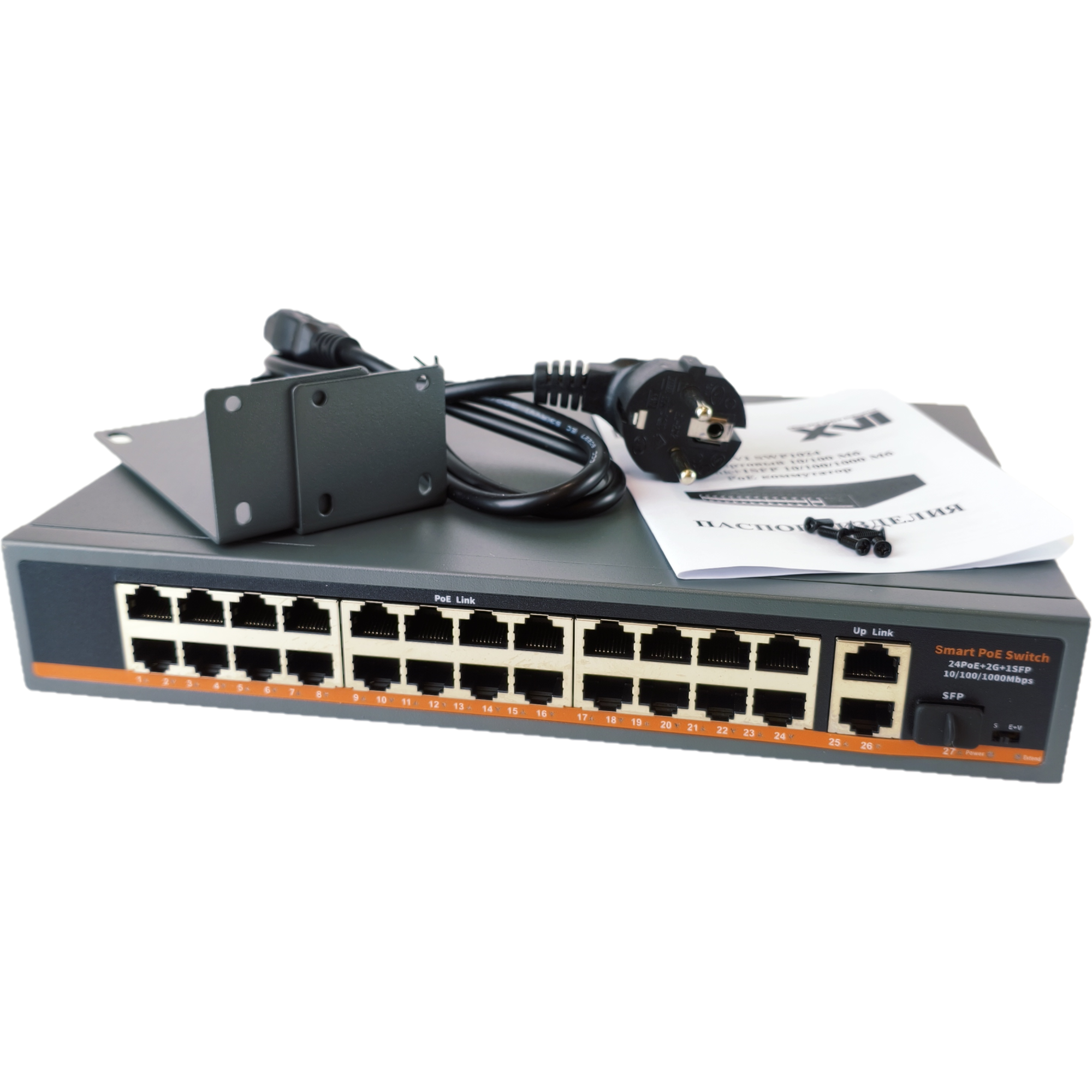 Коммутатор XVI SWP1024, 27_портов: 24_порта 100Мбит/с с PoE + 2_порта 1Гбит/с + 1xSFP, 400Вт